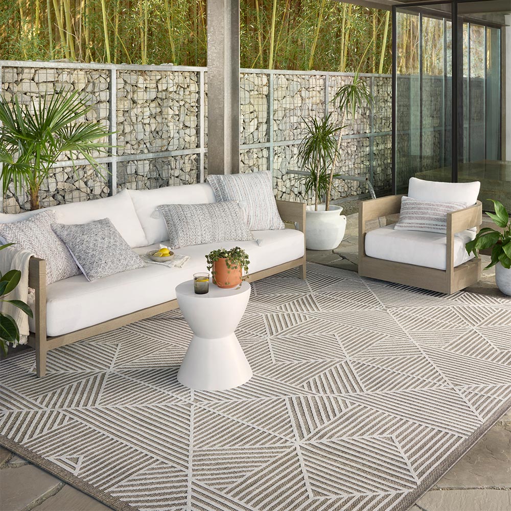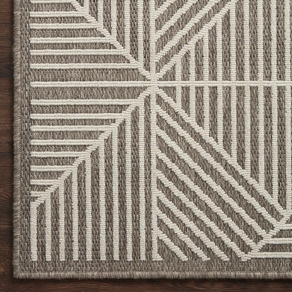 La colección Rainier, confeccionada con telar mecánico de pelo 100% polipropileno en Egipto, presenta tonos neutros y patrones contemporáneos. Rainier es una colección para interior/exterior, especialmente tratada para resistir la lluvia, el sol y otros elementos del exterior.